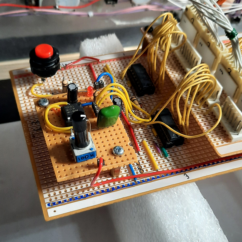 I figured the issue was the clock source (a simple 555 timer) but could not see any obvious problems; no dry joints, no dead components or shorts, nothing. I even made a separate timer on a breadboard and it was working perfectly with the Step button, and then made a new timer on veroboard and it was not working again…